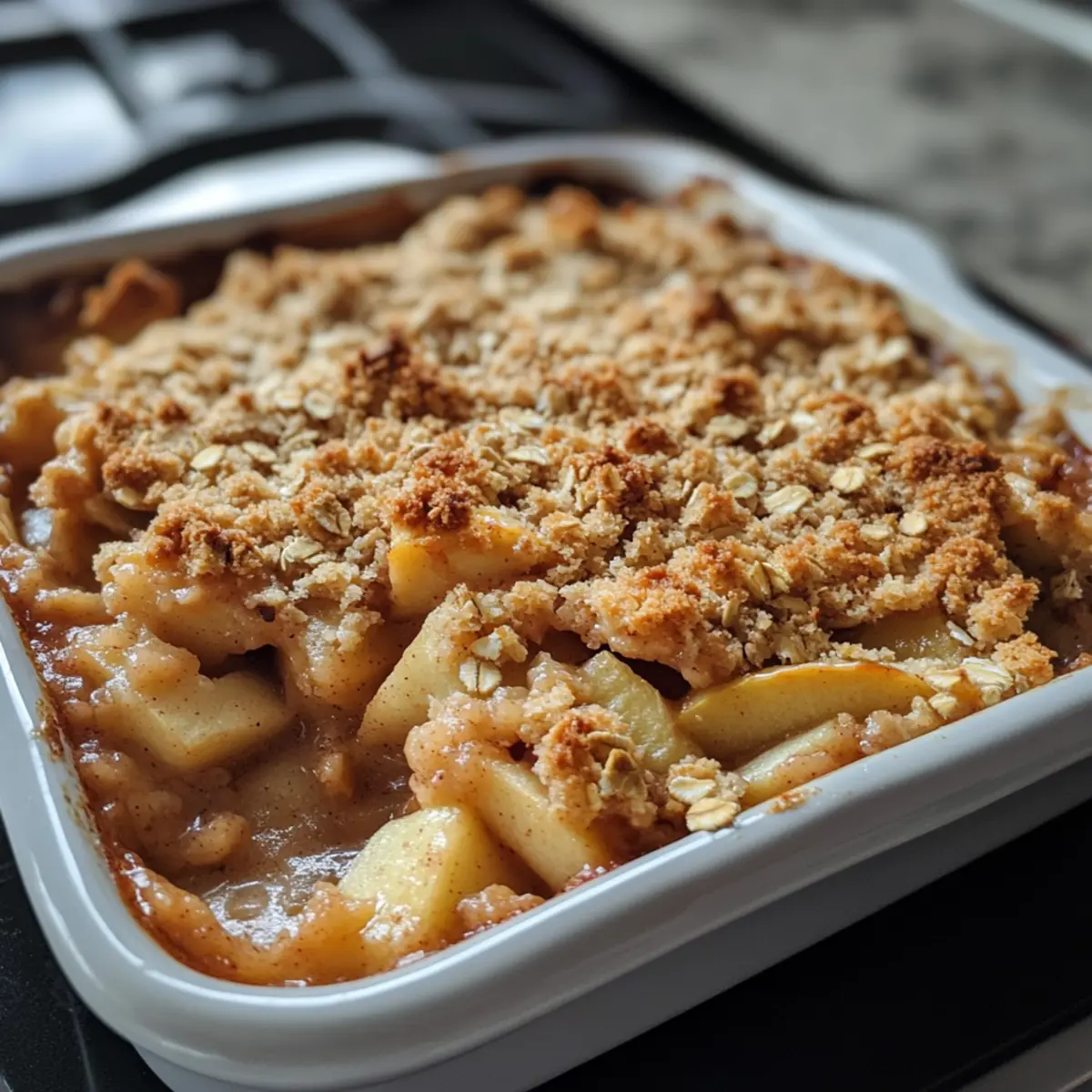 - Assemble: Spread the apple filling evenly in a greased baking dish, then sprinkle the oat crumble topping over it, covering every slice for a perfectly golden crust.