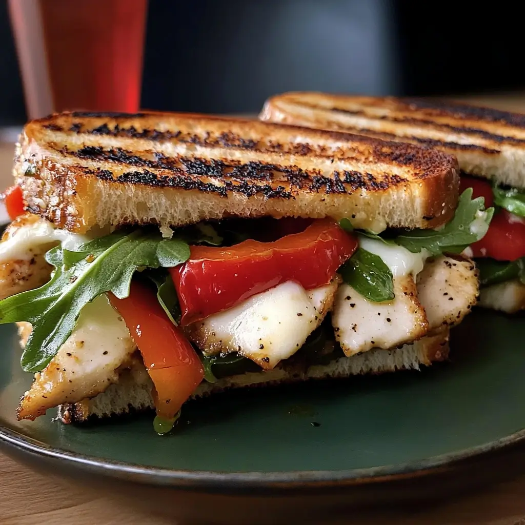 When serving, consider slicing the panini diagonally to showcase the beautiful layers of chicken, melted cheese, vibrant peppers, and fresh arugula. The visual appeal is part of the enjoyment!