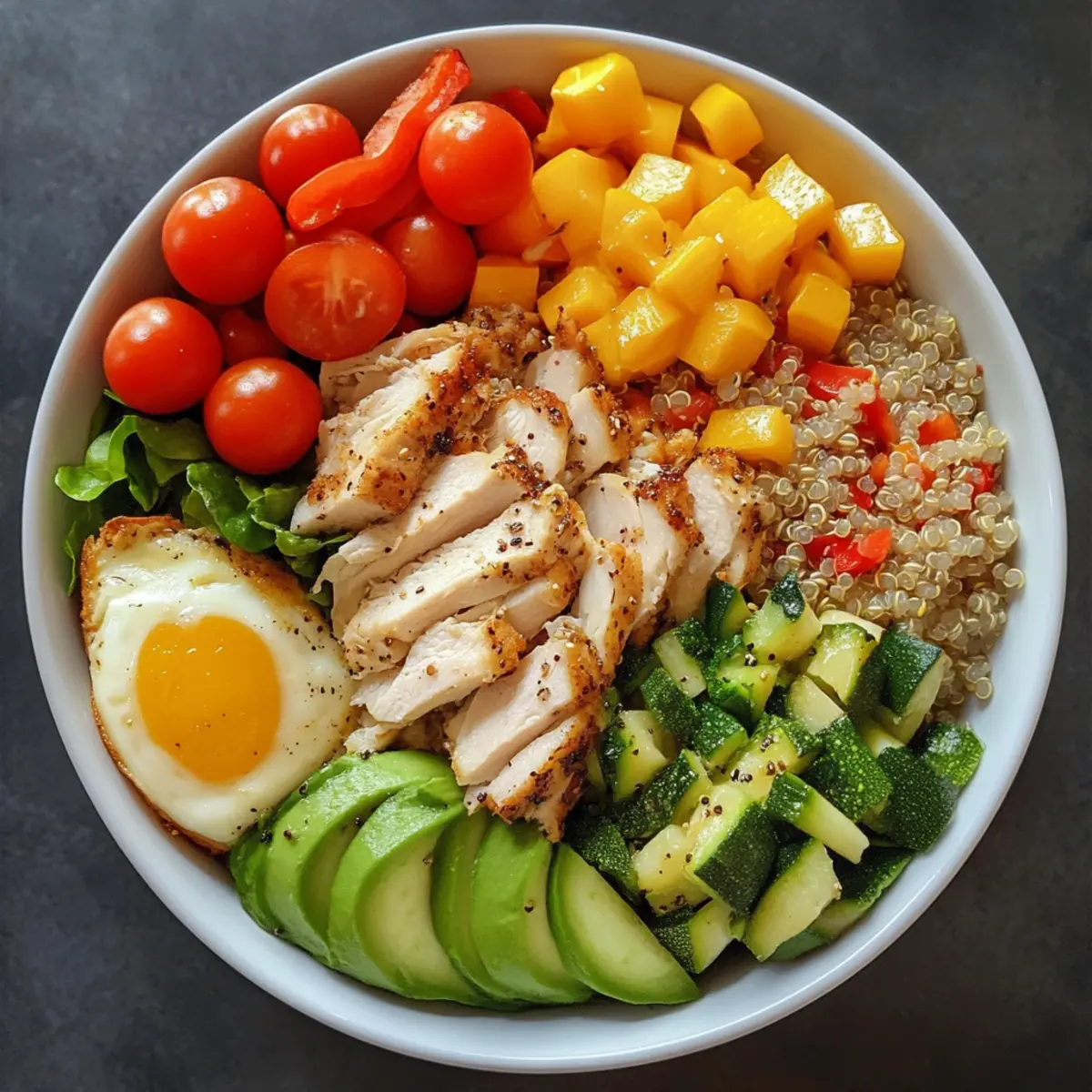 Assemble the Bowl: Spread quinoa evenly in bowls. Arrange sliced chicken and veggie medley on top, creating a vibrant layer of colors and textures that pops against the fluffy grains.