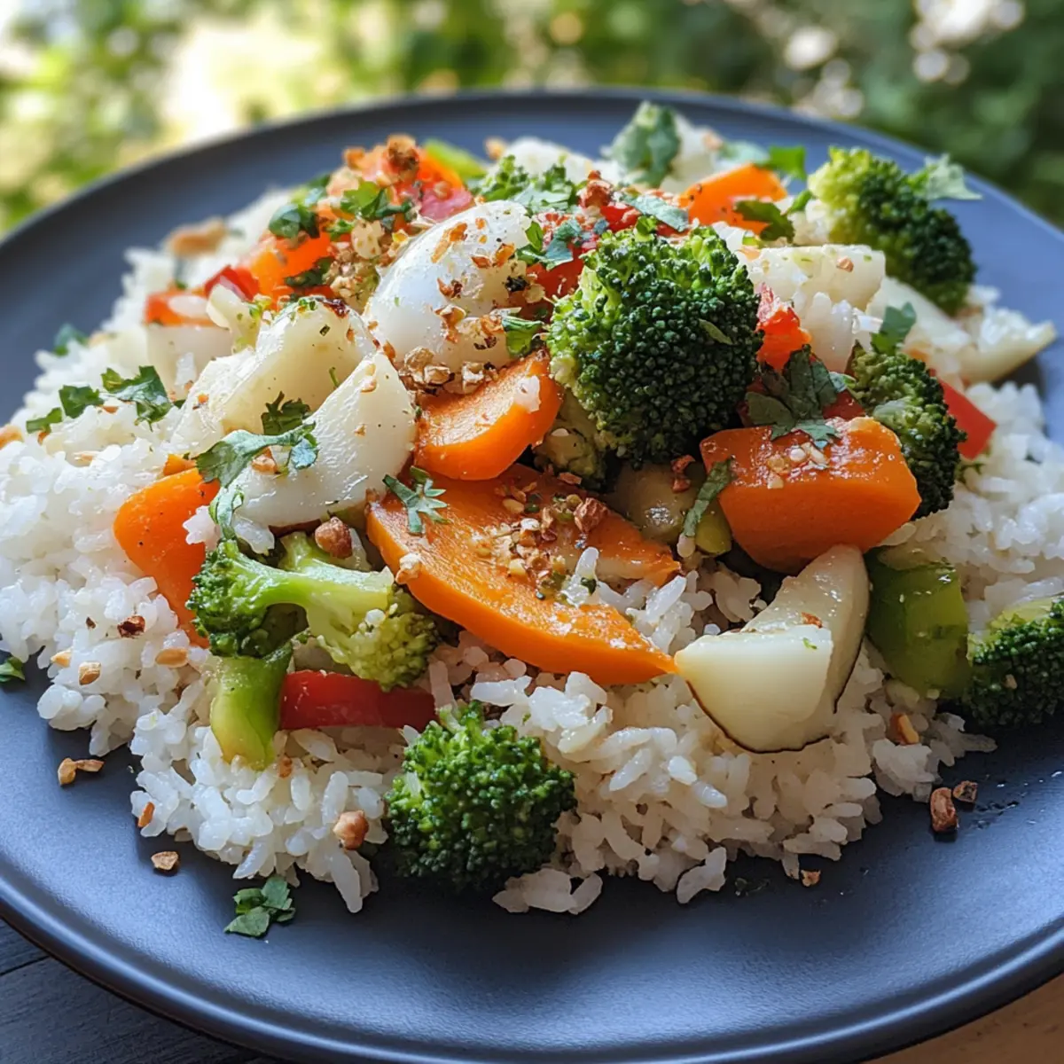 - Assemble Plate: Divide the creamy coconut rice among plates, top with the colorful vegetable mixture, and garnish to your heart’s content with fresh herbs or nuts.