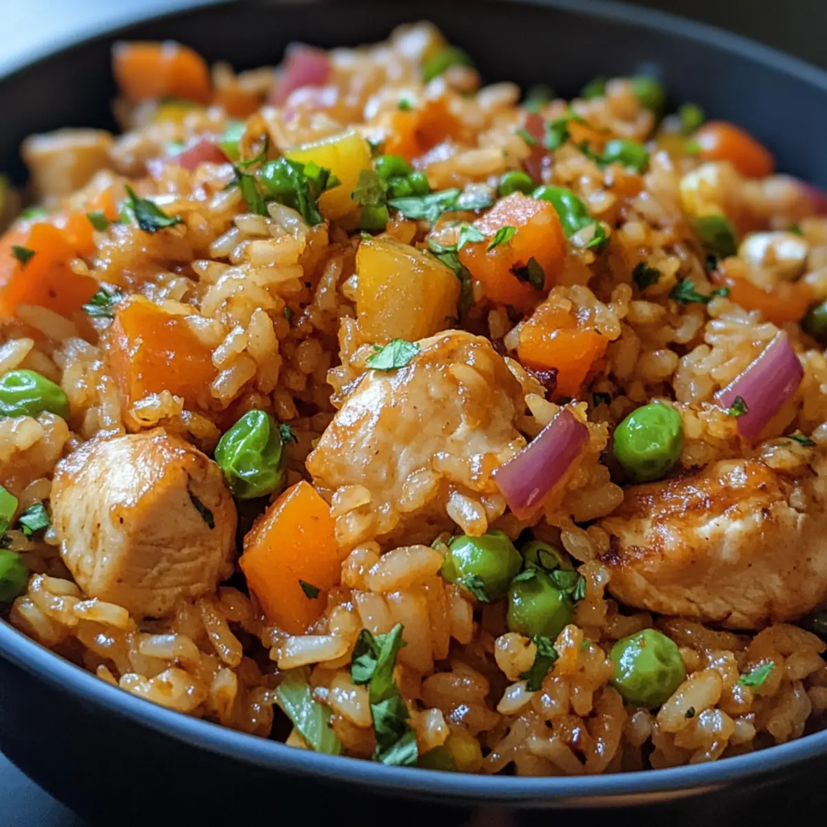 - Add Veggies: Combine onion, carrot, bell pepper, and garlic over the rice, gently mixing so colors and textures are well distributed for visual appeal.