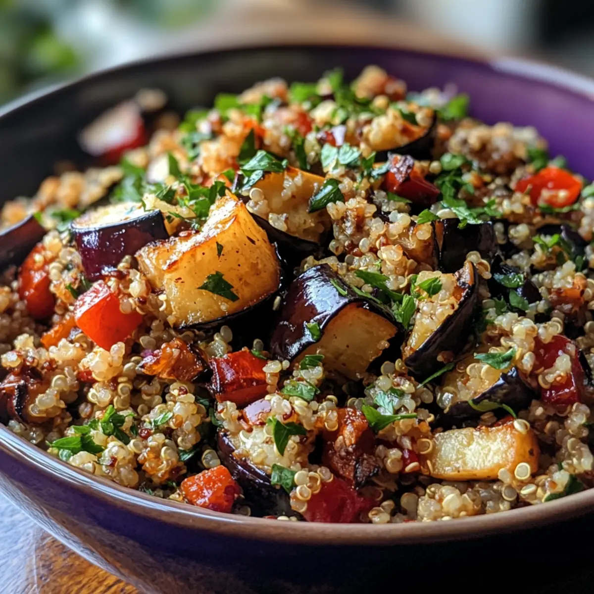 - Toss salad: In a large bowl, gently combine roasted eggplant, fluffy quinoa, halved cherry tomatoes, sliced red onion, and freshly chopped parsley.