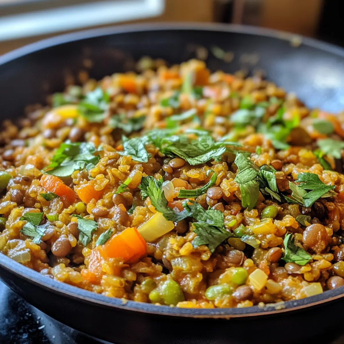 - Reduce heat to low, cover skillet, and cook for 20–25 minutes until lentils are tender and rice is fluffy.