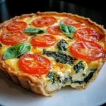 - 8 – 10 fresh basil leaves: Fresh basil leaves bring a burst of aromatic, peppery-sweet flavor to the quiche. Laying them flat on top of the spinach allows their flavor to infuse the entire filling. The fragrant basil perfectly complements the tomatoes and mozzarella, creating a classic Italian-inspired flavor combination. Dried basil can be used in an emergency, but fresh basil truly elevates the dish.