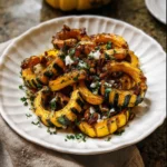 Of all the signs that autumn has truly arrived, none are as welcome in my kitchen as the appearance of delicata squash. The first time I brought one home, I was drawn in by its beautiful, cream-colored, and green-striped skin. I wasn’t sure what to do with it, but I knew it held promise. That evening, I stumbled upon what would become one of my family’s most requested fall side dishes: Maple Roasted Delicata Squash. The beauty of this recipe is its profound simplicity. With just a handful of pantry staples, the humble delicata is transformed into something spectacular. The oven’s high heat coaxes out its natural, brown sugar-like sweetness, while the maple syrup glaze caramelizes into a candy-like coating on the edges. The earthy notes of fresh thyme cut through the richness, creating a perfectly balanced bite that is both comforting and elegant. My kids, who are often skeptical of new vegetables, now cheer when they see me slicing into a delicata, knowing that these tender, golden crescents will soon emerge from the oven. It has become our go-to side for everything from a simple weeknight roasted chicken to the centerpiece of our Thanksgiving table. It’s more than just a recipe; it’s the taste of fall, a warm hug on a plate, and a testament to how the best food is often the simplest.