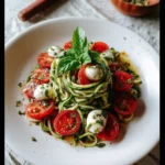 Of all the summer recipes that grace my kitchen, this Zucchini Noodle Caprese is the one that truly sings the song of the season. I remember the first time I made it, a sweltering July afternoon when the thought of turning on the stove was simply unbearable. My garden was overflowing with zucchini, my basil plant was a fragrant jungle, and a farmers’ market trip had left me with the most beautiful, sun-ripened cherry tomatoes. Instead of a heavy pasta, I decided to spiralize the zucchini into light, refreshing “zoodles.” I tossed them with the classic Caprese trio—juicy tomatoes, creamy mozzarella, and aromatic basil—and finished it with a drizzle of rich olive oil and a sweet, tangy balsamic glaze. The result was instantaneous love. My family, initially skeptical of “vegetable pasta,” devoured it. It was bright, crisp, satisfyingly fresh, and felt both indulgent and incredibly healthy. It has since become our official “it’s too hot to cook” meal, our go-to for light lunches, and the most requested side dish for every summer barbecue. It’s more than a recipe; it’s a celebration of summer’s best, captured in one beautiful, effortless bowl.